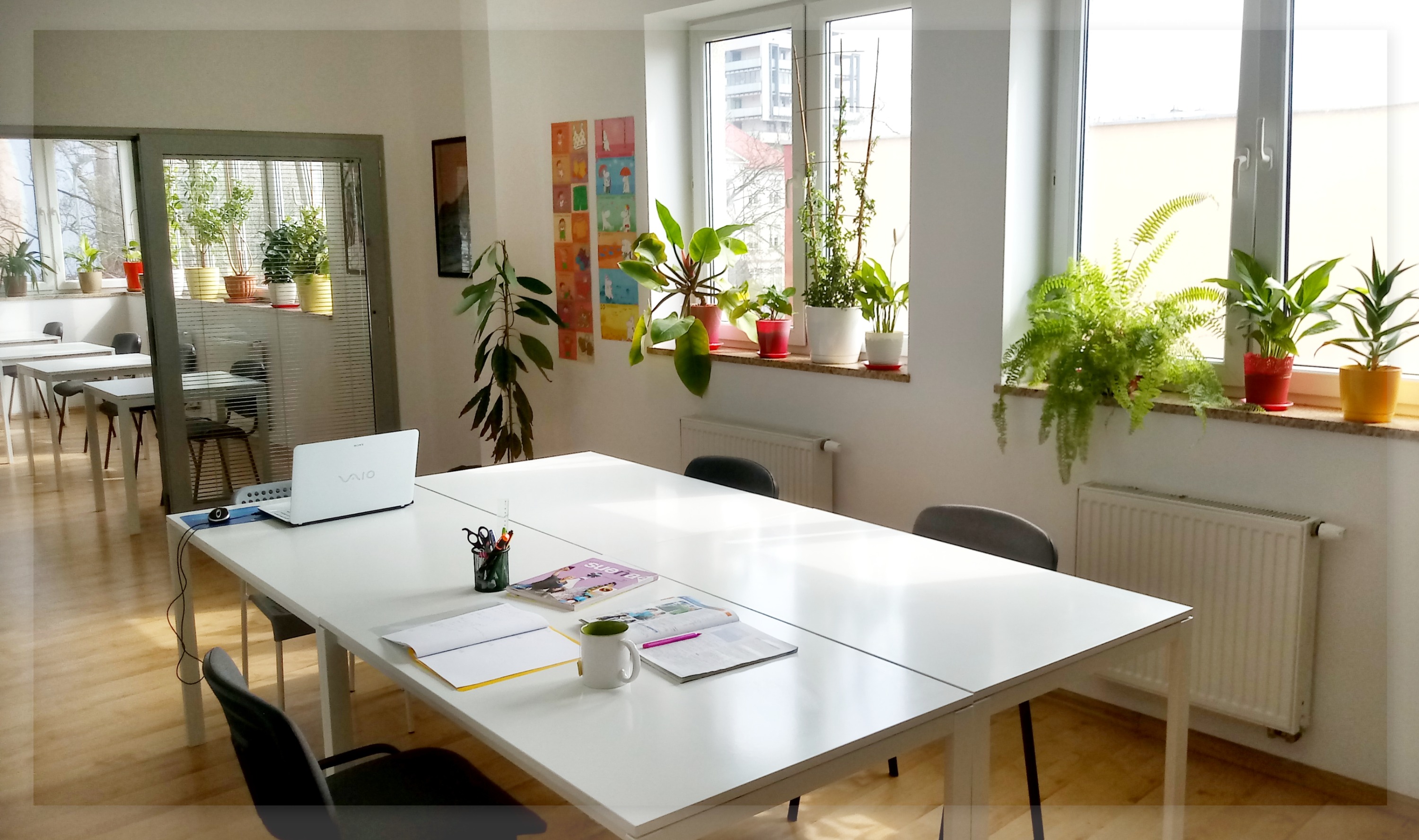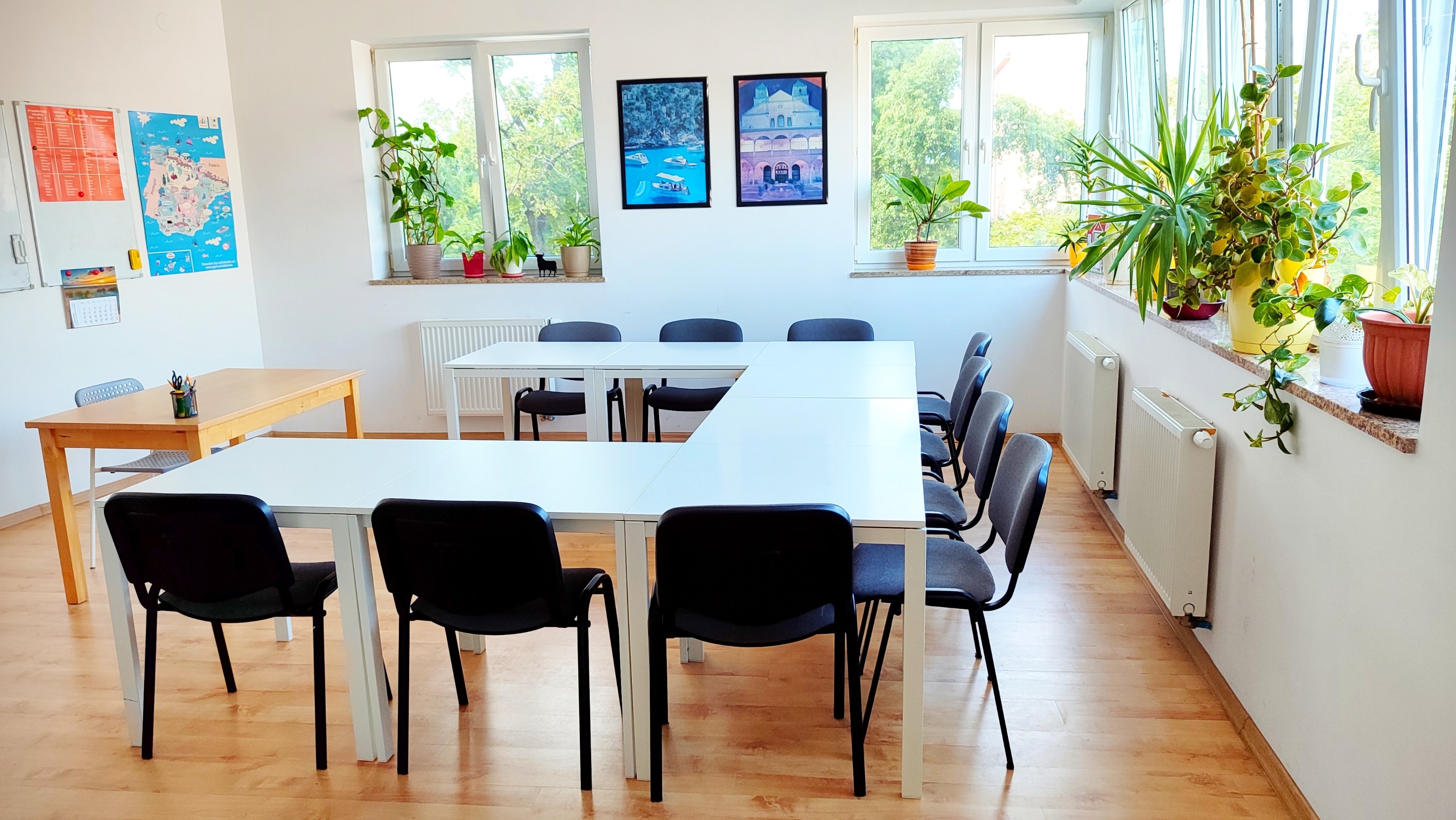 Nasza szkoła mieści się w centrum Płocka, na rogu Alei Jachowicza i ulicy 1 Maja. Bezpłatny parking i przystanek autobusowy są dosłownie pod drzwiami. W budynku jest winda. Sale lekcyjne są duże, jasne, pełne zieleni i hiszpańskich symboli. Do dospozycji naszych uczniów oddaliśmy poczekalnię, szatnię i toaletę. Oferujemy im również dostęp do wody mineralnej, pomocy naukowych i publikacji po hiszpańsku. Zobacz, jak wygląda nasza szkoła od wewnątrz (galeria zdjęć poniżej).